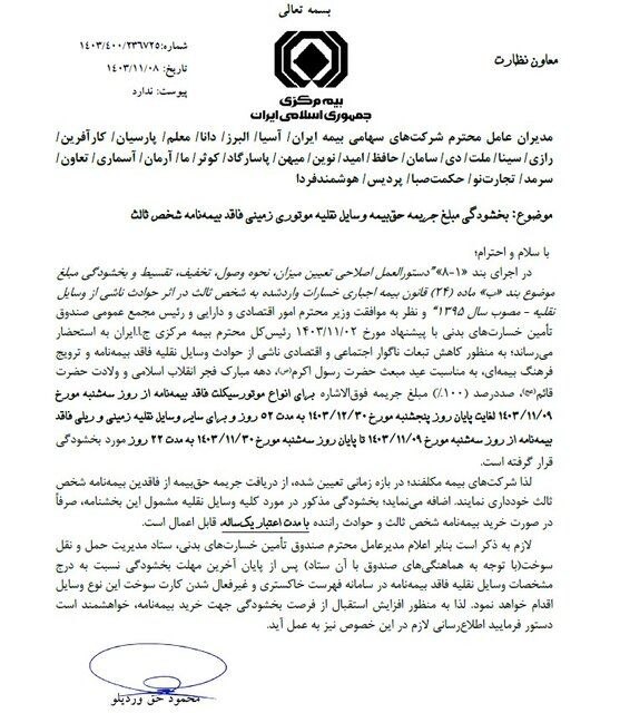 بخشنامه-بخشودگی-مبلغ-جریمه-حق-بیمه-وسایل-نقلیه-موتوری-زمینی-فاقد-بیمه-نامه-شخص-ثالث
